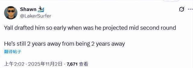 球迷Shawn寫道:“你們當初選他選得也太早瞭吧——之前預測他也就第二輪中段才能被選中。他現在的水平,就算再等兩年,距離能打出來也還得再等兩年。”