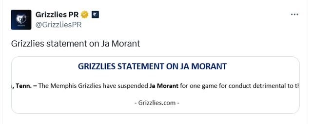 北京時間11月2日,孟菲斯灰熊隊官方宣佈,將對後衛莫蘭特禁賽一場,理由是其行為對球隊造成不利影響。