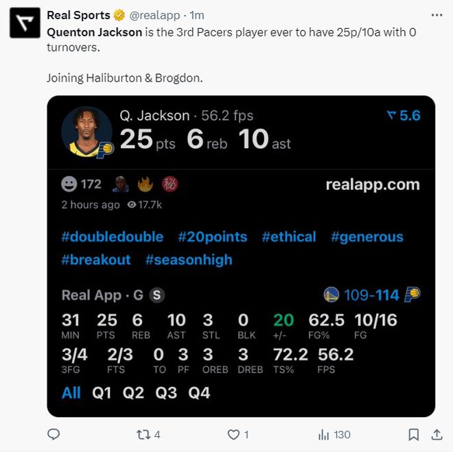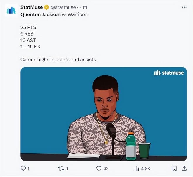 而昆廷-傑克遜全場比賽31分鐘,16中10,三分4中3,罰球3中2,拿到25分10助攻6籃板3搶斷,命中率62.5%,三分命中率75%,真實命中率65.4%。