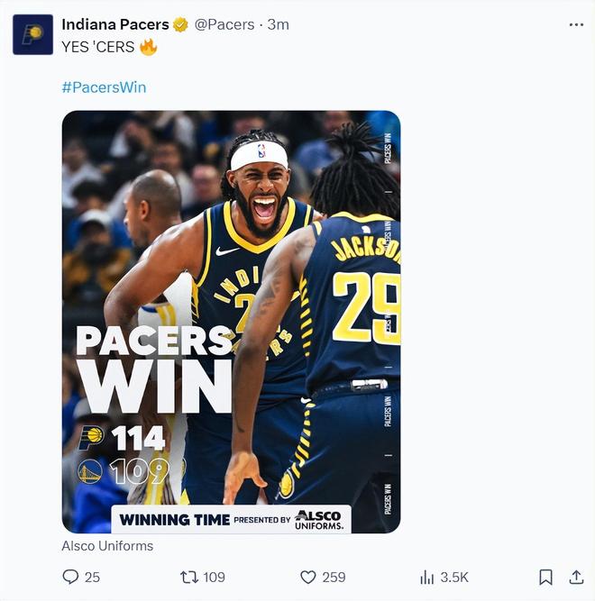 北京時間11月2日,步行者114-109逆轉勇士拿到新賽季的首勝,目前1勝5負。這場比賽步行者一度落後勇士11分之多,可他們在末節完成瞭大逆轉,拿著雙向合同的昆廷-傑克遜成為整個印第安納的英雄,他末節5中5拿到12分完爆斯蒂芬-庫裡。