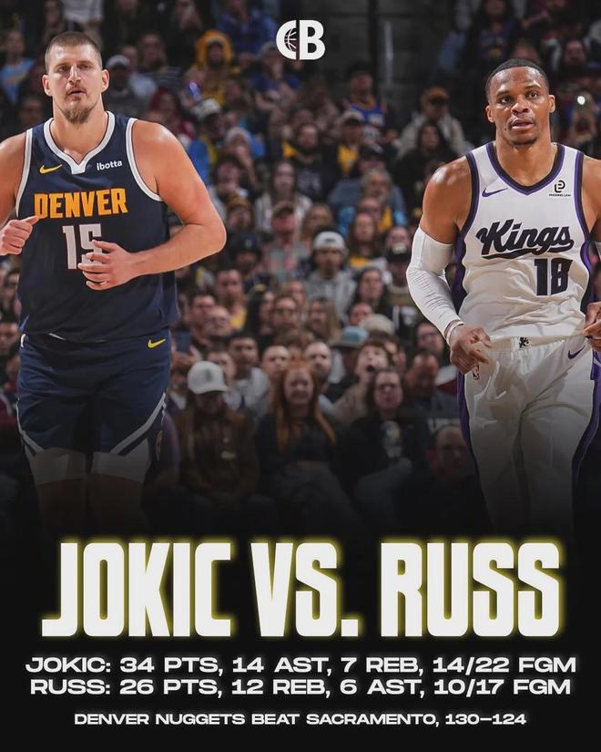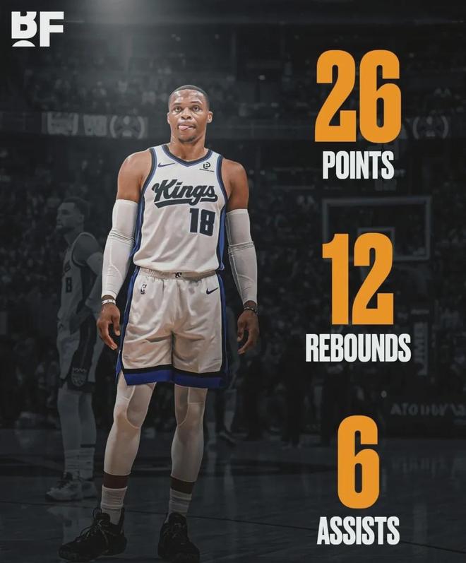 國王124-130不敵掘金,此役威少以首發大前鋒身份出戰,面對老東傢打出本賽季最強一戰,約37分鐘時間裡,投籃17中10,其中三分球6中3,罰球3中3砍下26分12板6助2斷炸裂數據。