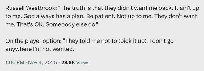 據威少本人的說法,是掘金不想讓他回來,其也不願待在一個不需要自己的隊伍,所以就分道揚鑣瞭......