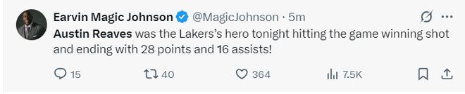賽後魔術師評價這場比賽:裡夫斯是這場比賽的英雄,他不僅拿到28分16助攻還命中瞭絕殺一球。