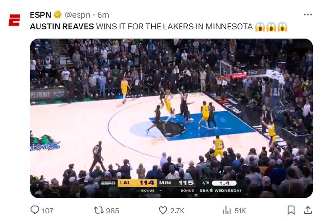 裡夫斯也直接登上瞭全美第一熱搜,裡夫斯這場比賽的手感並不好,但他命中瞭制勝一球他就是這個夜晚的第一超巨。