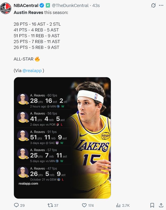 美媒曬出本賽季裡夫斯開賽階段的數據:26分9助攻5籃板、25分11助攻7籃板、51分11籃板9助攻、41分5助攻4籃板、28分16助攻2搶斷,高呼裡夫斯已經是全明星球員。