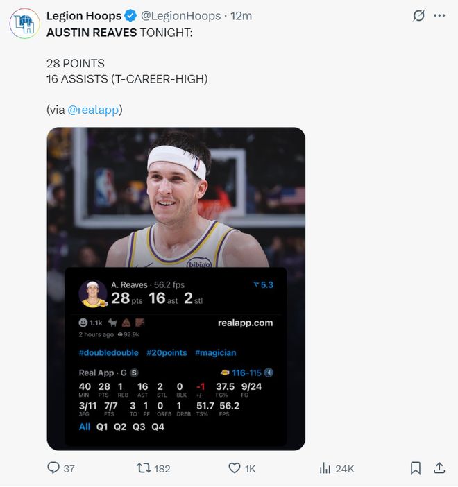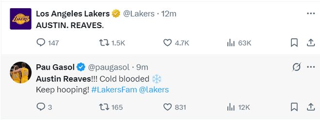 湖人官方發瞭一個奧斯汀-裡夫斯的名字。