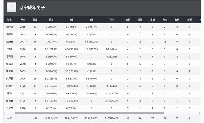 遼寧男籃:俞澤辰21分6板1助2帽、付豪20分5板3助、原帥18分1板1助、劉雁宇14分6板1助、趙繼偉12分4板9助、鄢手騏12分2板2助、韓德君7分1板、李虎翼6分4板1助2斷、高詩巖4分2板8助2斷。