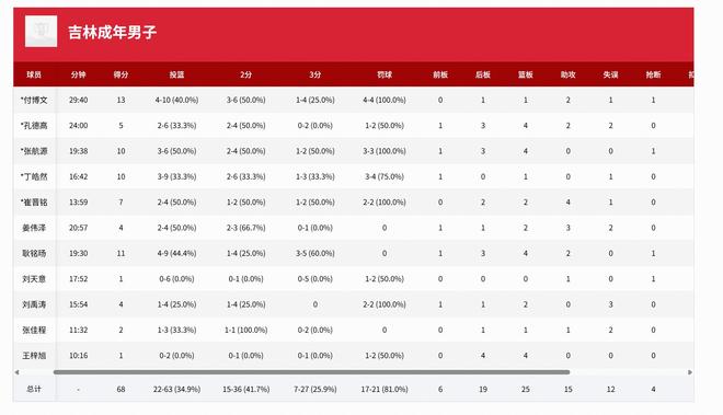 吉林男籃:付博文13分1板2助、耿銘暘11分4板1助、張航源10分3板、丁皓然10分1板、崔晉銘7分2板4助、薑偉澤4分2板3助、劉禹濤4分2板;