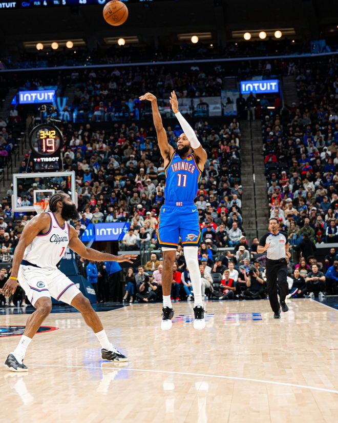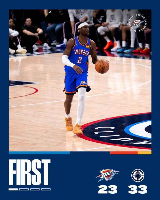 雷霆隊的亞歷山大得到30分、4個籃板和12次助攻,喬得到22分,華萊士得到12分,霍姆格倫得到11分和5個籃板,哈爾滕施泰因得到10分和7個籃板,維金斯得到12分。快船隊的哈登得到25分、6個籃板和6次助攻,科林斯得到17分和4個籃板,瓊斯得到16分,大洛得到12分,博格達諾維奇得到11分、6個籃板和4次助攻。