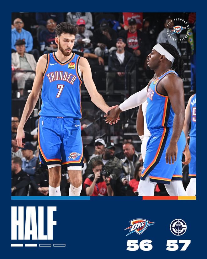 快船隊的哈登上半場得到22分、5個籃板和4次助攻,科林斯得到15分;雷霆隊的亞歷山大得到12分和7次助攻,喬得到11分。
