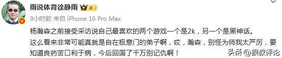 北京時間11月3日,網(wǎng)紅籃球評論員徐靜雨更新社媒發(fā)文:“楊瀚森之前接受采訪說自己最喜歡的兩個遊戲一個是2k,另一個是黑神話。