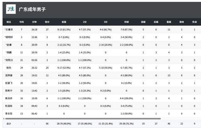 96-73!廣東全運男籃又贏瞭,以23分優勢,大勝瞭江蘇隊,斬獲全運會2連勝。要知道,在半場打完的時候,廣東隊還落後7分,但第三節開局一波18-0,直接帶走瞭勝利,不得不說,杜鋒玩得就是心跳。徐傑爆發,獨砍29分5助攻,真是太穩瞭,而胡明軒就差點意思瞭,7投0中,靠罰球拿到2分。而趙睿同樣低迷,12投2中,隻拿到8分4助攻。