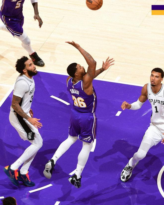 易邊再戰,馬刺一度找回節奏,巴恩斯連續得分,文班也加強內線沖擊,三節結束時馬刺以96比88領先8分,然而,裁判的頻繁哨聲讓比賽節奏屢屢中斷,雙方犯規數不斷累積,湖人4名球員身背4犯,馬刺也有2人陷入犯規麻煩,這樣的局面一直延續到末節,文班亞馬在比賽還剩1分39秒時領到第6次犯規離場,隨後巴恩斯與索漢也相繼犯滿,馬刺內線陷入真空
