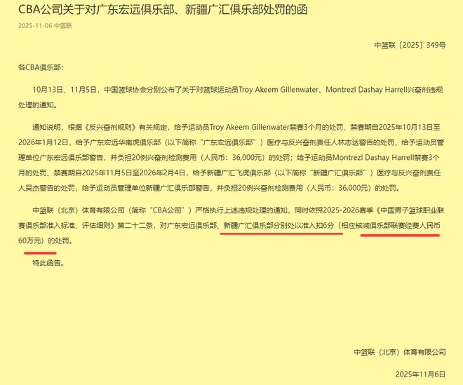 重拳出擊!繼中國籃協對廣東宏遠隊和新疆隊外援興奮劑違規做出處罰之後,CBA也及時進行追加處罰:準入扣6分+60萬元的罰款,球迷拍手叫好!