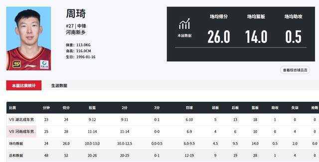 於是,我們就看到瞭,對(duì)陣湖北隊(duì),周琦打瞭23分鐘,12投9中,10罰6中,砍下24分18籃板,率隊(duì)63分大勝。對(duì)陣河南隊(duì),周琦打瞭25分鐘,14投11中,9罰6中,砍下28分10籃板,率隊(duì)24分大勝。