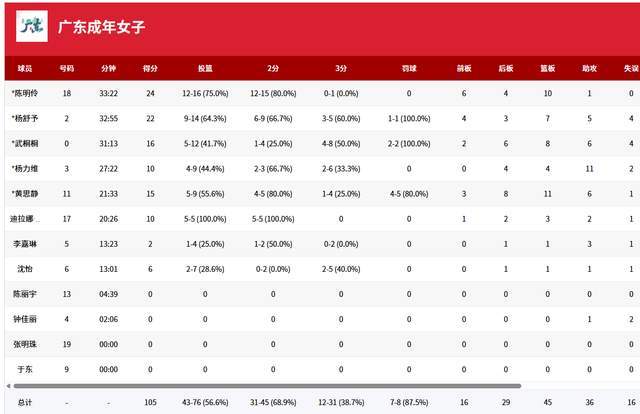 廣東隊多達6人得分上雙,陳明伶24分10籃板,楊舒予22分7籃板5助攻,楊力維10分4籃板11助攻,武桐桐16分8籃板6助攻,黃思靜15分11籃板6助攻,迪拉娜10分3籃板。