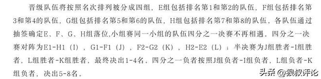 晉級隊伍將按照名次排列被分成四組,E組包括排名第1和第2的隊伍,F組包括排名第3和第4的隊伍,G組包括排名第5和第6的隊伍,H組包括排名第7和第8的隊伍,各隊伍通過抽簽確定E、F、G、H組落位,小組賽同一小組的隊伍四分之一決賽不再相遇。四分之一決