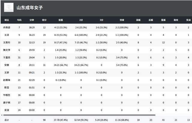 山東隊4人得分上雙,老將安靜21投14中,獨砍31分9籃板4助攻,王英竹17投8中,拿到19分12籃板,王澤19分4籃板4助攻,喬燕姿12分5籃板3助攻。
