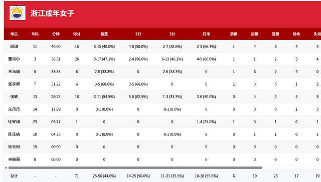 再看浙江隊,沒有萬濟圓和王佳琦,實力下降不少,全隊3人得分上雙,董可爾空砍26分3助攻,周琪16分5籃板4助攻,張敏16分4籃板4助攻。