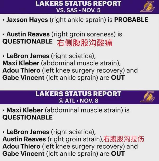 裡夫斯的傷情報告,已從最初的“右腹股溝酸痛”更改為“右腹股溝拉傷”......