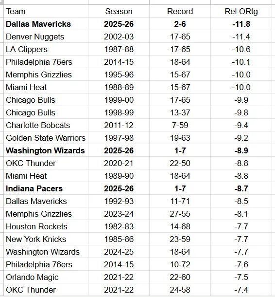 多說一句,這賽季的獨行俠,開局2勝7負西部墊底,很大一部分原因就是因為進攻不行,一個數據是,本賽季獨行俠的相對進攻效率(球隊進攻效率-聯盟平均效率)隻有-11.8,這個數字不僅僅是本賽季最差,甚至還是歷史最差——看至此,你大概能理解為何這才開賽不到10場比賽,獨行俠就想著交易湯普森瞭。
