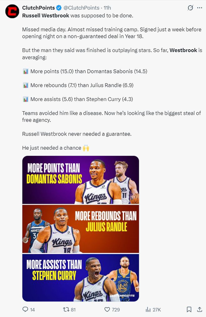 賽前美媒Clutchpoints寫道:威少本該就此退役,錯過瞭媒體日、錯過瞭訓練營,開賽前一周才簽下一份無保障底薪。