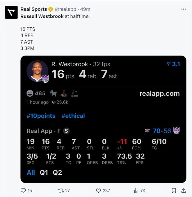 上半場打完19分鐘裡,威少10中6,三分5中3,拿到16分7助攻4籃板,真實命中率73.5%,隻可惜面對強大的雷霆還是無法幫助球隊縮小分差。