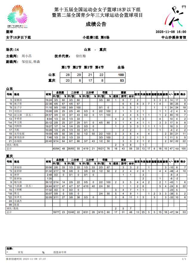 11月8日一共打瞭4場比賽,下午16點,第一小組打瞭2場,山東隊對陣重慶隊,結果呢,張子宇繼續爆發,隻打瞭11分鐘,9投9中,砍下18分,小姑娘還在比賽中上演瞭扣籃,雖然看起來有些勉強,但總算是扣瞭,扣瞭就好啊。山東隊以100-53大勝對手,3戰全勝,鎖定小組第一,晉級強。孫瑞陽22分,張子宇9投9中得到18分,宋丹佑妮11分。重慶隊馬嘉潞22分,藍舒婷10分。