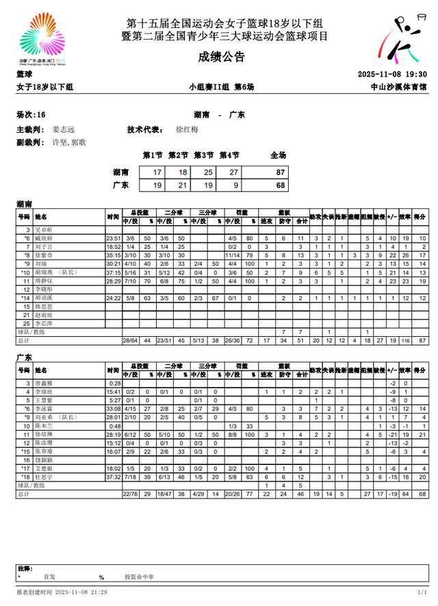 晚上19:30,第二小組打響瞭2場收官之戰,湖南隊對陣廣東隊。沒想到,東道主居然爆冷輸球瞭,以68-87不敵湖南隊。湖南隊六人得分上雙,周靜儀19分,徐紫奇17分13籃板,劉瑞14分,胡瑞燕13分9籃板6助攻,胡語溪12分,臧欣妍10分11籃板。廣東隊徐培琳21分,杜思宇20分12籃板,李泳霖14分7助攻。湖南隊3戰3勝,鎖定小組第一,廣東隊2勝1負,小組第2。