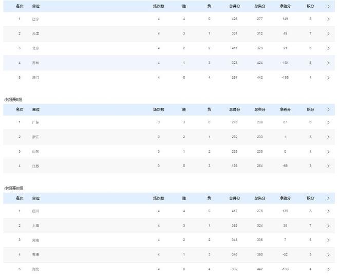 Ⅰ小組的小組第三名是北京隊,去掉和小組墊底的澳門隊比賽的凈勝分後,北京隊的凈勝分是+31分;Ⅱ小組的第三名是山東隊,這個小組隻有四支球隊,不用經過另外的計算,山東隊的凈勝分就是是0分;Ⅲ小組的的小組第三名是河南隊,去掉和湖北隊比賽的凈勝分後,河南隊的凈勝分是-13分。也就是說,北京隊和山東隊是兩個成績最好的小組第三名,兩支球隊也攜手晉級八強。