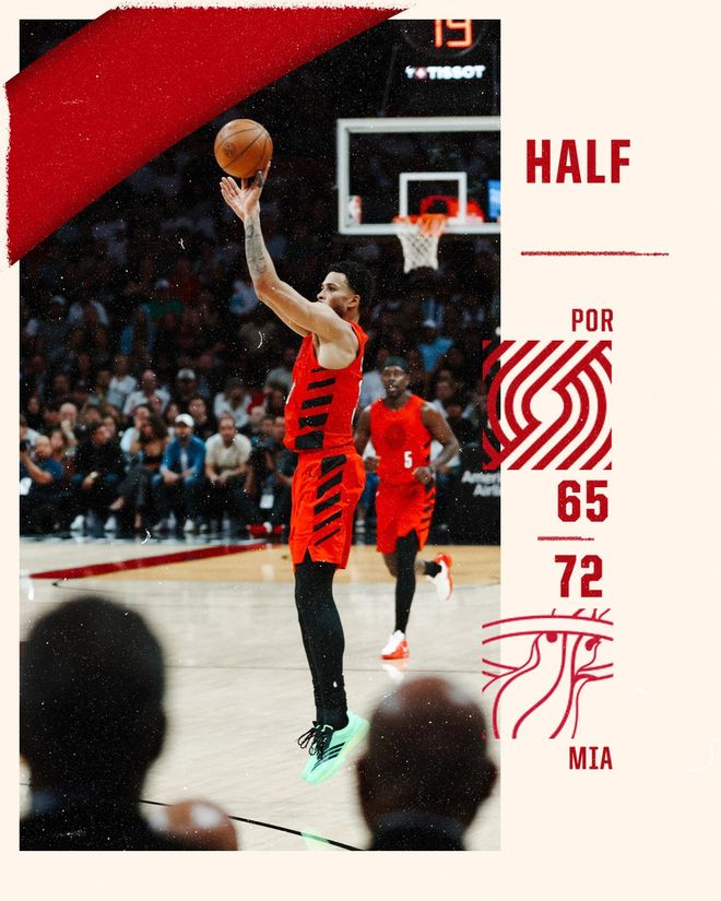熱火隊的維金斯上半場得到12分,拉爾森和史密斯各得到10分;開拓者隊的阿夫迪亞得到14分、5個籃板和5次助攻,霍勒迪得到12分和5次助攻,格蘭特得到10分。