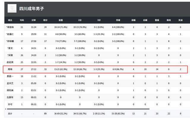 周琦真是太不講情面瞭,面對(duì)自己所在的俱樂(lè)部,居然火力全開,打瞭27分鐘,21投13中,三分球3投1中,9罰6中,砍下全場(chǎng)最高的33分14籃板,絲毫不顧忌老帥許利民的壓面,也算是條漢子瞭。胡金秋14投10中,4罰4中,拿到24分4籃板。孫銘徽17分8助攻。趙嘉仁11分4助攻。