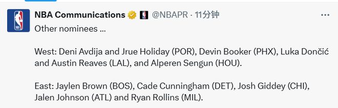 西部:阿夫迪亞和霍勒迪(開拓者)、佈克(太陽)、東契奇和裡夫斯(湖人)、申京(火箭)