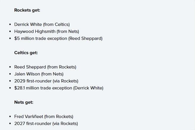 這筆交易的成本是送走謝潑德(一位需要更多時間和更重要的角色來穩步成長的新秀),以及兩個未來首輪簽——這兩個簽位分別是火箭隊在2027年和2029年選秀中順位第二高的簽。