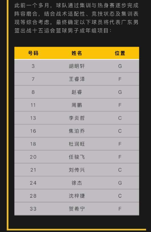 按照規則,全運會最終隻能報名12人,如今,廣東隊的12人終於出爐瞭,那就是:胡明軒、徐傑、趙睿、王睿澤、周鵬、賀希寧、李炎哲、劉傳興、焦泊喬、杜潤旺、任駿飛、沈梓捷。