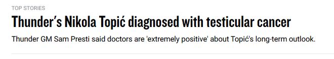 北京時間10月31日,此前,球迷們隻知道雷霆後衛托皮奇接受瞭一項與睪丸相關的手術,但並不清楚具體情況。雷霆總經理普雷斯蒂今日官宣瞭托皮奇的癌癥診斷結果,真相才得以公佈。