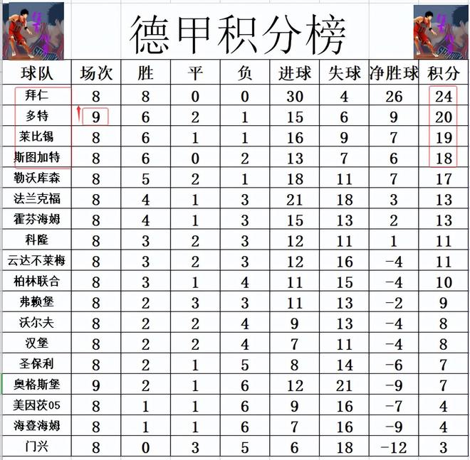 積分榜方面,拜仁繼續(xù)保持全勝,8連勝的他們高居榜首,多特今天先賽贏球后,暫時(shí)超過(guò)斯圖加特和萊比錫升至第2,落后拜仁4分。輸球的奧格斯堡仍在降級(jí)區(qū)邊緣徘徊,只比美因茨多3分排在倒數(shù)第4。