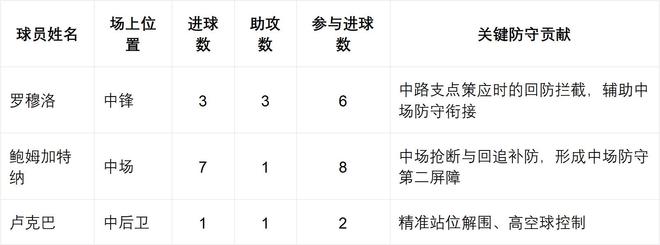 羅慕洛“中路回防銜接”的貢獻,填補了中場前插后的空當,使萊比錫4-3-3陣型在進攻擴寬時,中路防守不脫節,保障攻防轉換的連貫性。鮑姆加特納作為中場核心,在與韋德拉奧果的協同補防上,通過高頻次回追和搶斷,瓦解對手反擊,為后防線減輕壓力。同時作為“隱藏火力點”,讓球隊進攻形成“三叉戟+中場后插上”的雙重威脅,破解對手“專注防守三叉戟”的戰術,大幅提升容錯率。而盧克巴則通過精準站位提前解圍對手傳中,高空球控制率80%左右,有效抑制對手邊路傳中戰術,配合門將古拉奇和老將奧爾班,構建起“高空+地面”雙重防守屏障。