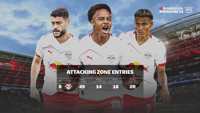 通過分析AWS提供的德甲比賽數據,我們了解了RB萊比錫在第八輪表現中的"進攻區域"分布和"預期進球"效率。("進攻區域"含義為球隊攻入了對方的三十米區域,這是通過將該區域劃分為四個大小相等的垂直區域來實現的。)