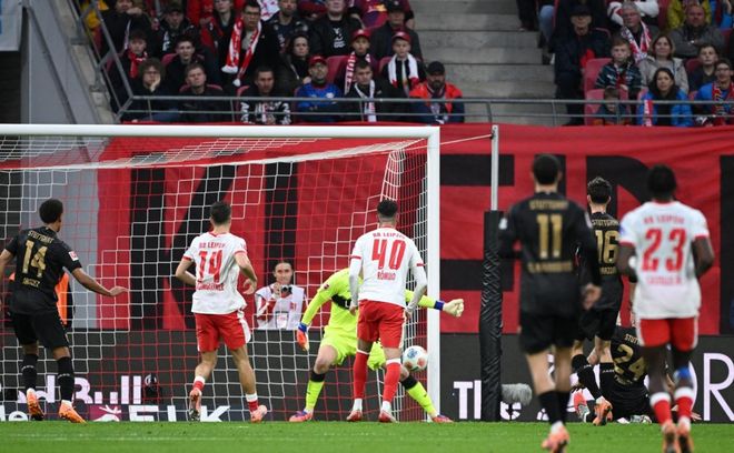 第41分鐘,羅慕洛近距離射門,打遠角,皮球稍稍偏出左側立柱,差之毫厘。第45分鐘,萊比錫進球了!沙博特在門前伸腳解圍,結果把球擋進自家球門。這粒烏龍球讓斯圖加特陷入被動局面。半場結束,萊比錫1-0領先斯圖加特。萊比錫上半場控球率43%,10次射門,5次射正,進了1球。而斯圖加特上半場9次射門,沒能進球。