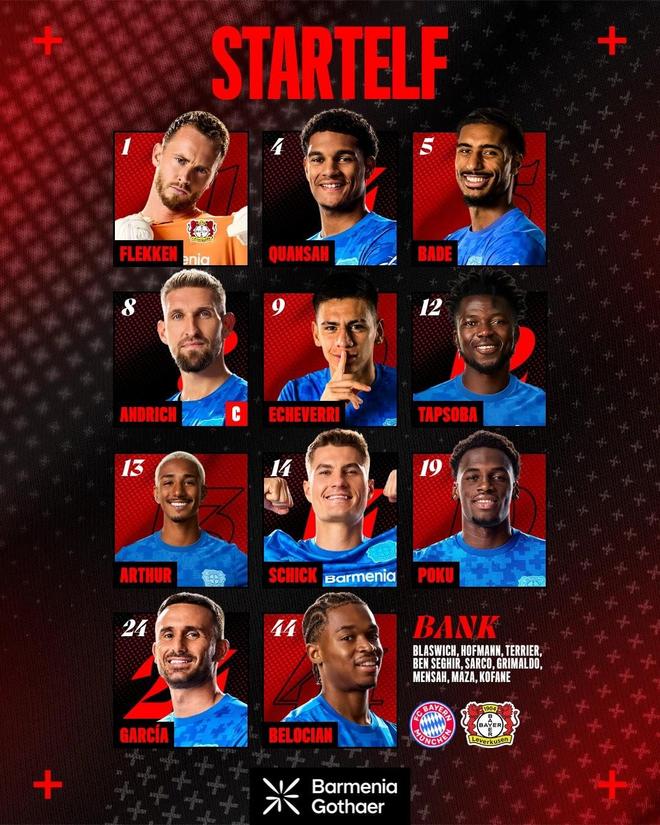 勒沃庫森首發:1-弗萊肯、44-貝洛西安、12-塔普索巴、5-巴代、4-夸安薩、8-安德里希、24-阿萊士-加西亞、13-阿圖爾、19-波庫、14-希克、9-埃切韋里