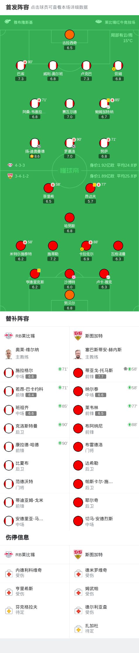 北京時間11月1日,德國足球甲級聯賽第9輪,RB萊比錫坐鎮主場迎戰斯圖加特。上半場沙博特門前自擺烏龍。下半場迪奧曼德內切破門擴大比分,隨后蒂亞戈-托馬斯單刀破門扳回一球,補時階段努貝爾超級低級失誤送禮,羅慕洛破門。最終萊比錫3-1戰勝斯圖加特。