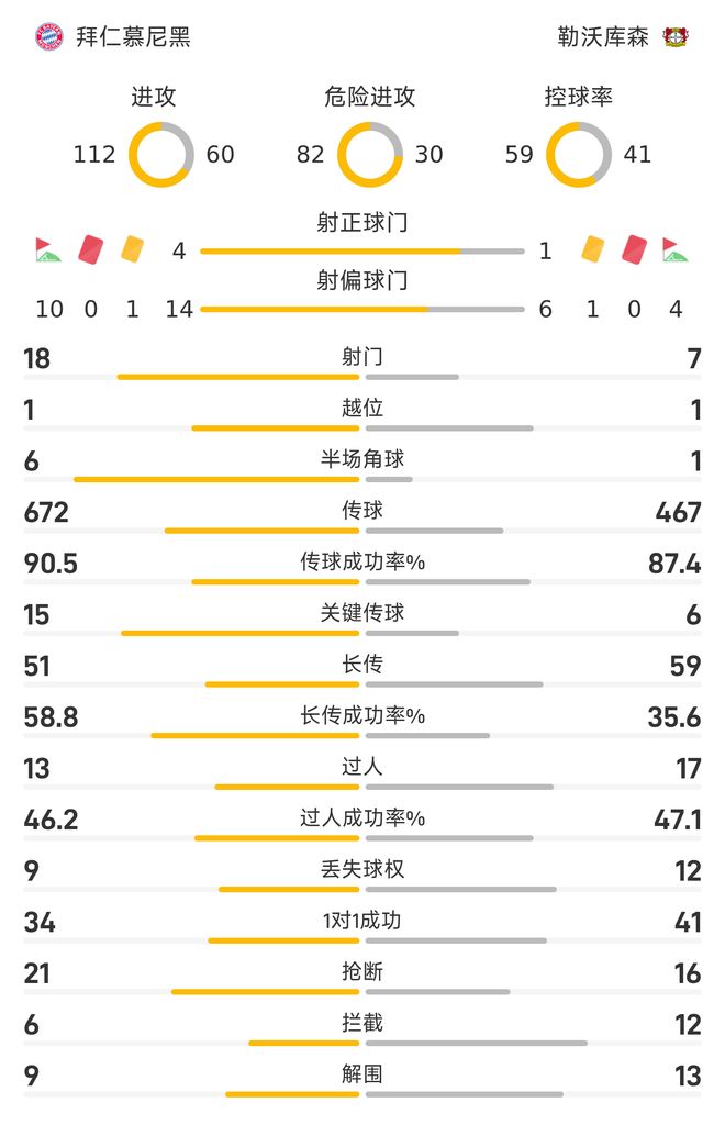 雷速體育11月2日訊 德甲第9輪,拜仁慕尼黑主場以3-0大勝勒沃庫森。整場比賽里,拜仁在數據方面呈現著壓倒性的態(tài)勢,獲得勝利實至名歸。
