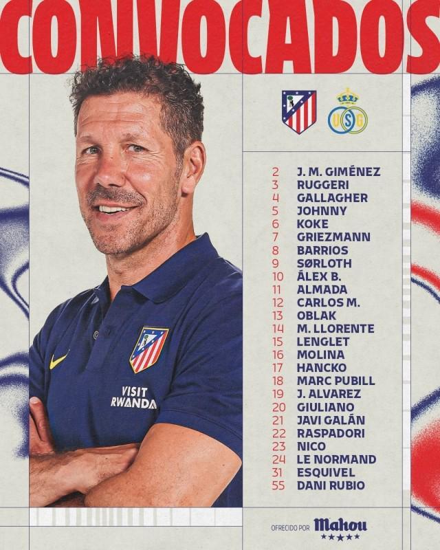 歐冠聯(lián)賽階段第4輪,馬德里競(jìng)技主場(chǎng)迎戰(zhàn)圣吉勒斯聯(lián)。床單軍團(tuán)公布大名單,胡利安、格列茲曼領(lǐng)銜。 馬競(jìng)大名單: 門將:奧布拉克、埃斯基韋爾、達(dá)尼·魯維奧 后衛(wèi):何塞·希門尼斯、魯杰里、略倫特、朗格萊、納韋爾·莫利納、漢茨科、普維爾、加蘭、勒諾爾芒 中場(chǎng):加拉格爾、約翰尼·卡多索、科克、巴勃羅·巴里奧斯 前鋒:格列茲曼、瑟洛特、巴埃納、阿爾馬達(dá)、卡洛斯·馬丁、胡利安·阿爾瓦雷斯、朱利亞諾·西蒙尼、拉斯帕多里、尼古拉斯·岡薩雷斯