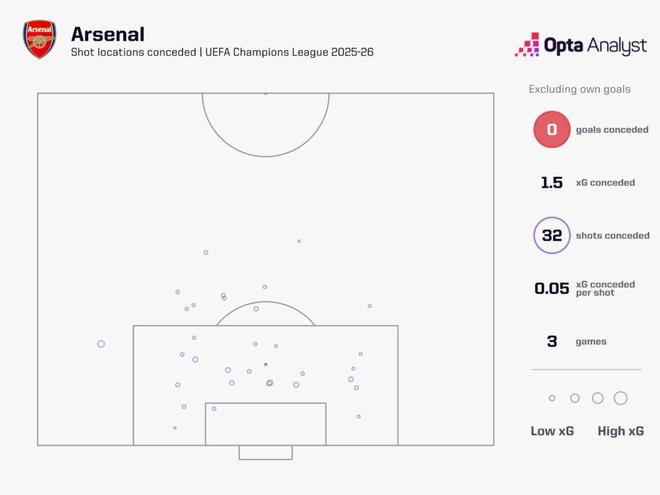 本賽季歐冠聯賽階段前三輪,阿森納三戰全勝,打入8球,一球未丟。