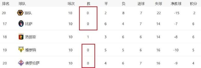 隨著熱那亞和門興格拉德巴赫兩隊成功“上岸”,目前本賽季歐洲五大聯賽賽場上,還剩下4支一勝難求的隊伍。這四支本賽季歐洲五大聯賽中0勝球隊,分別是英超的狼隊,以及意甲三支球隊比薩、維羅納和佛羅倫薩。