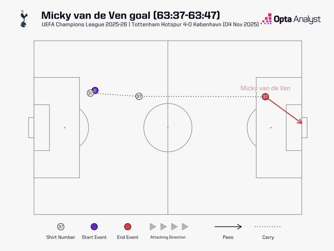 歐冠聯(lián)賽階段第四輪,熱刺主場(chǎng)4-0大勝哥本哈根,熱刺後衛(wèi)范德芬在下半場(chǎng)長(zhǎng)途奔襲打入一球,范德芬?guī)虮家u距離為67.7米,為有統(tǒng)計(jì)以來(lái)歐冠最長(zhǎng)的奔襲破門距離。