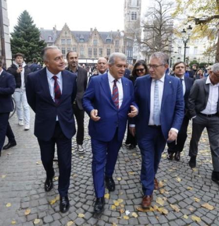 接待儀式結束後,巴薩代表團與市長一起步行十分鐘左右,穿過瞭佈滿鵝卵石街道的歷史中心區域,沿途是標志性的運河和中世紀建築,這使得佈魯日成為比利時最具代表性的城市之一。輕松的氛圍讓拉波爾塔得以回應一些在場球迷的問候,他們在主席漫步市中心時向他喊話。
