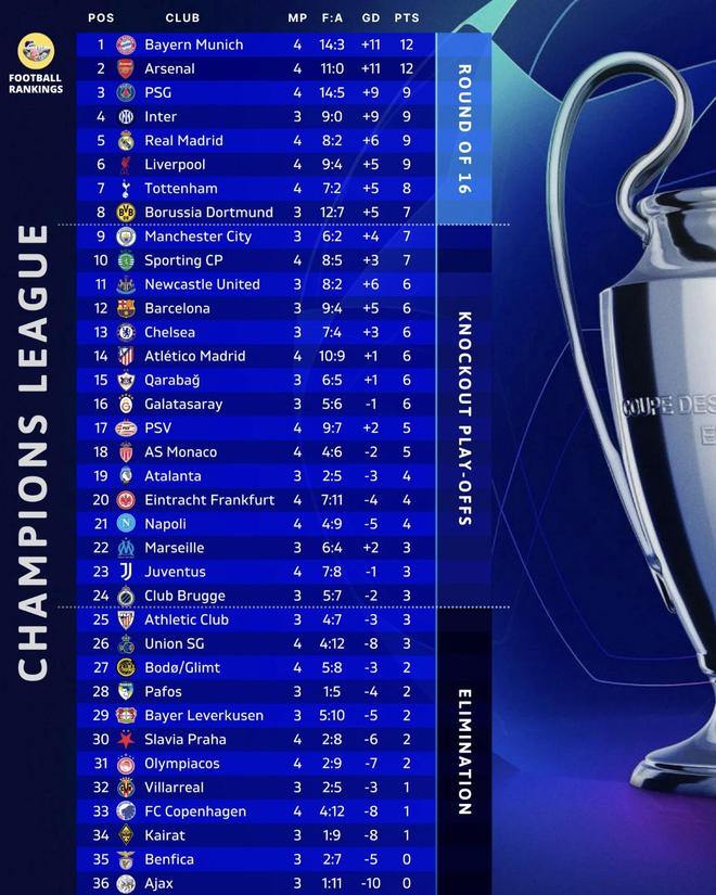 今天凌晨,歐冠聯(lián)賽階段第4輪開打。此前保持全勝的球隊(duì)中,拜仁客場(chǎng)2:1擊敗衛(wèi)冕冠軍巴黎,皇馬則是客場(chǎng)0:1不敵利物浦,阿森納3:0輕取弱旅佈拉格斯拉維亞。這樣的話,就隻剩拜仁和阿森納4輪全勝排在積分榜前兩位。