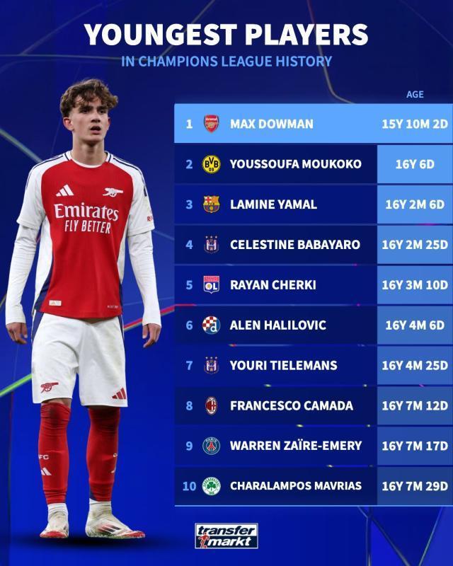 至此,槍手成為1969-70賽季的利茲聯后,史上第2支在單季歐冠前4場比賽全勝且不失一球的英格蘭球隊。此外,槍手還貢獻了一個歷史之最:小將道曼此役替補登場,超越穆科科和亞馬爾等人,以15歲308天的年齡,成為冠軍聯賽歷史上最年輕的出場球員。
